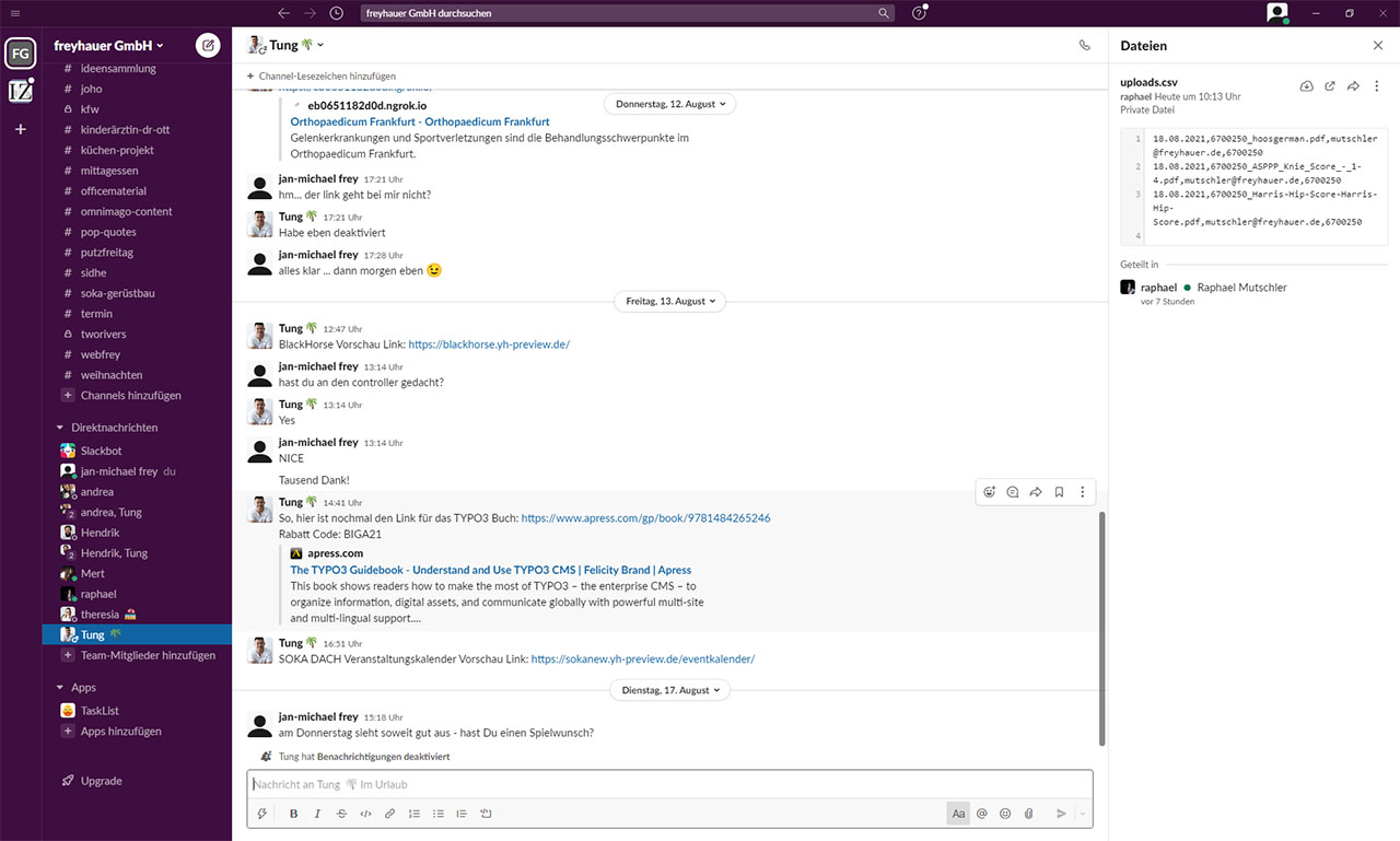 Slack haben wir vorher schon benutzt, aber da wir momentan sehr viel mehr als einen Flur weit voneinander entfernt sitzen, können wir nicht mehr einfach rüberrufen wenn wir etwas brauchen. So ist Slack unser Kommunikationstool für alle Fälle geworden: schnelle Aufgabenverteilung, kurze Infos, Rückfragen oder das allmorgendliche Motivations-gif (go Hendrik!).