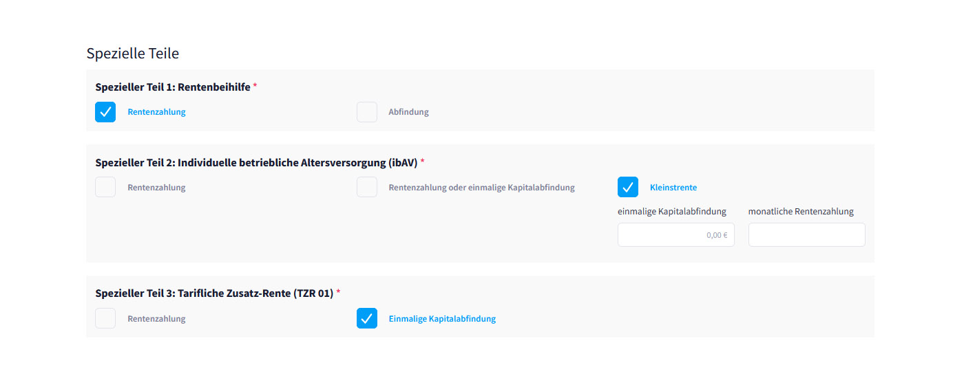 Das Antragsformular für Rentenleistungen ist kein einfaches Dokument. Durch die große Anzahl an unterschiedlichen Produkten, Anspruchsgrundlagen und Rentenbausteinen besteht dieser Antrag aus einem mehrseitigen Formular welches aus über 250! möglichen Dokumentvorlagen erstellt werden muss.