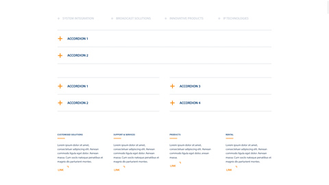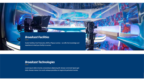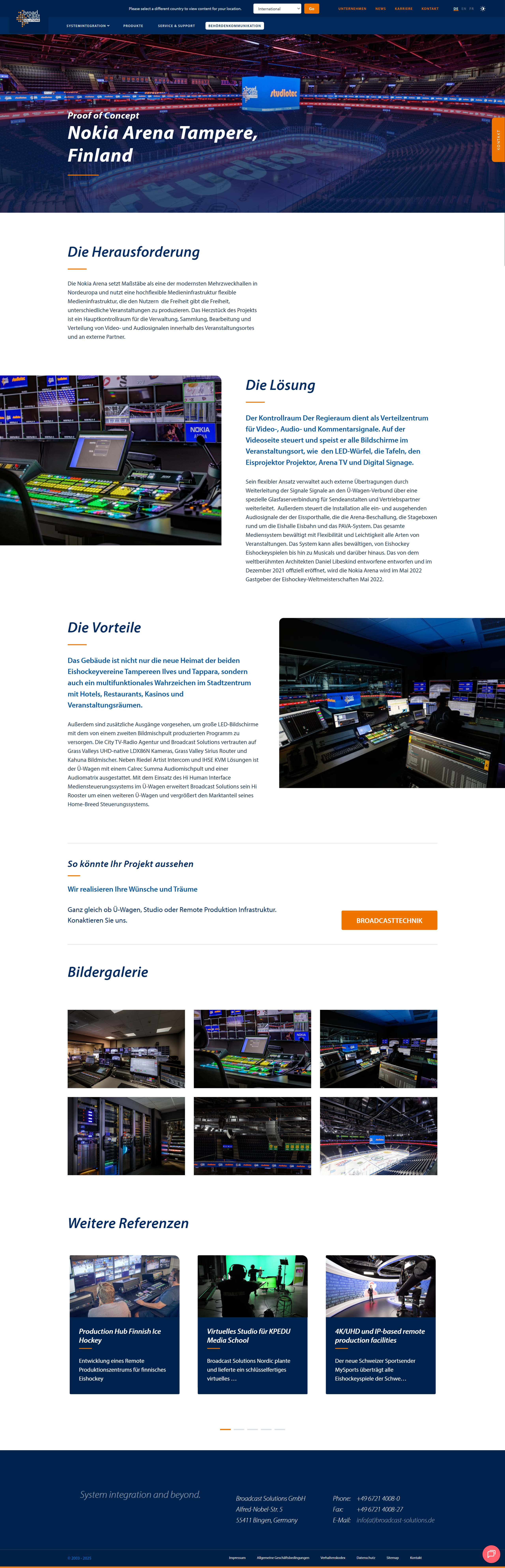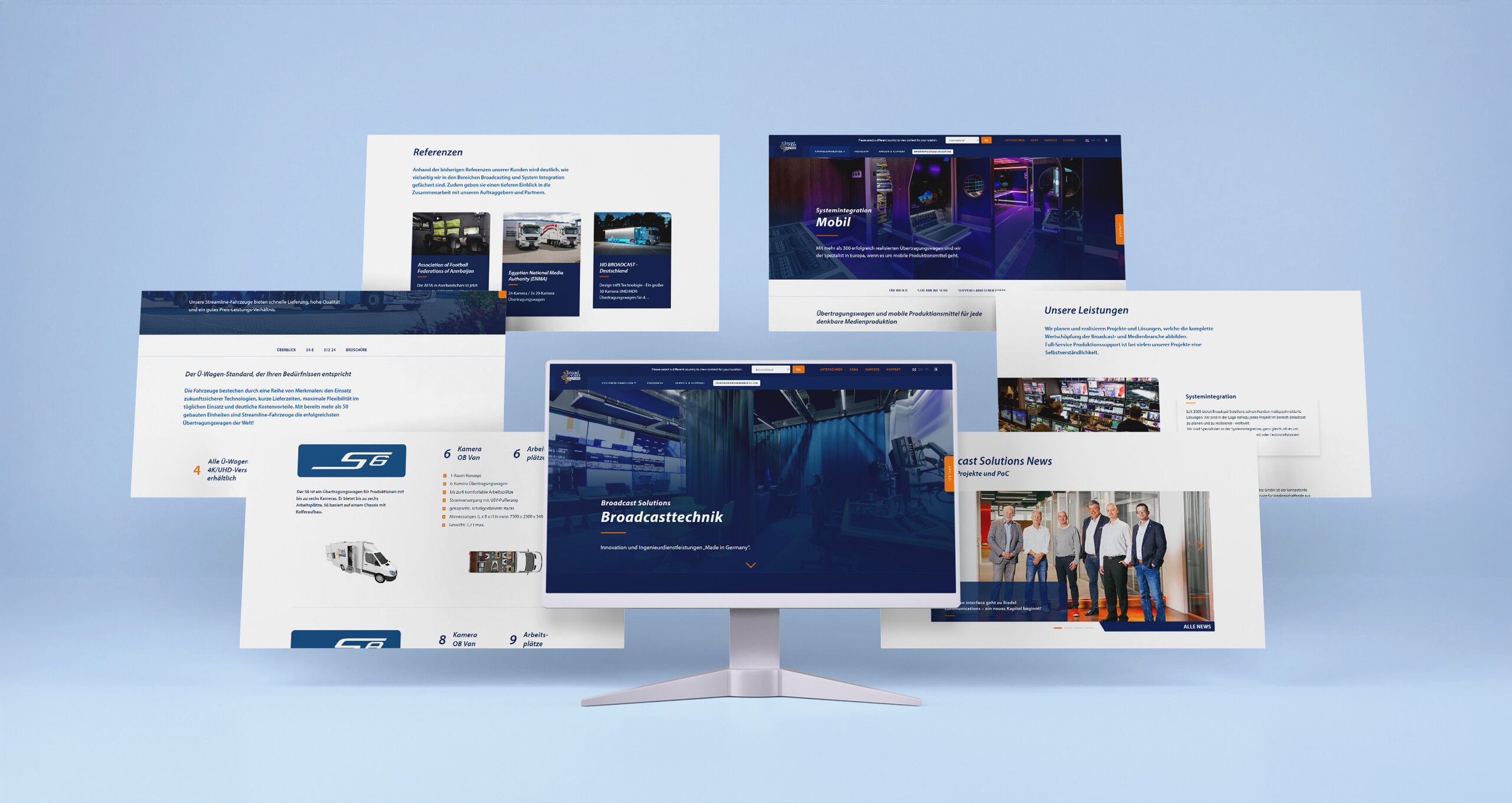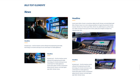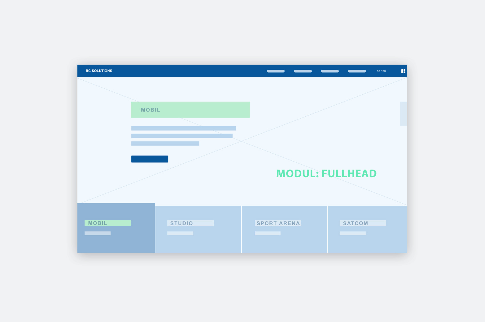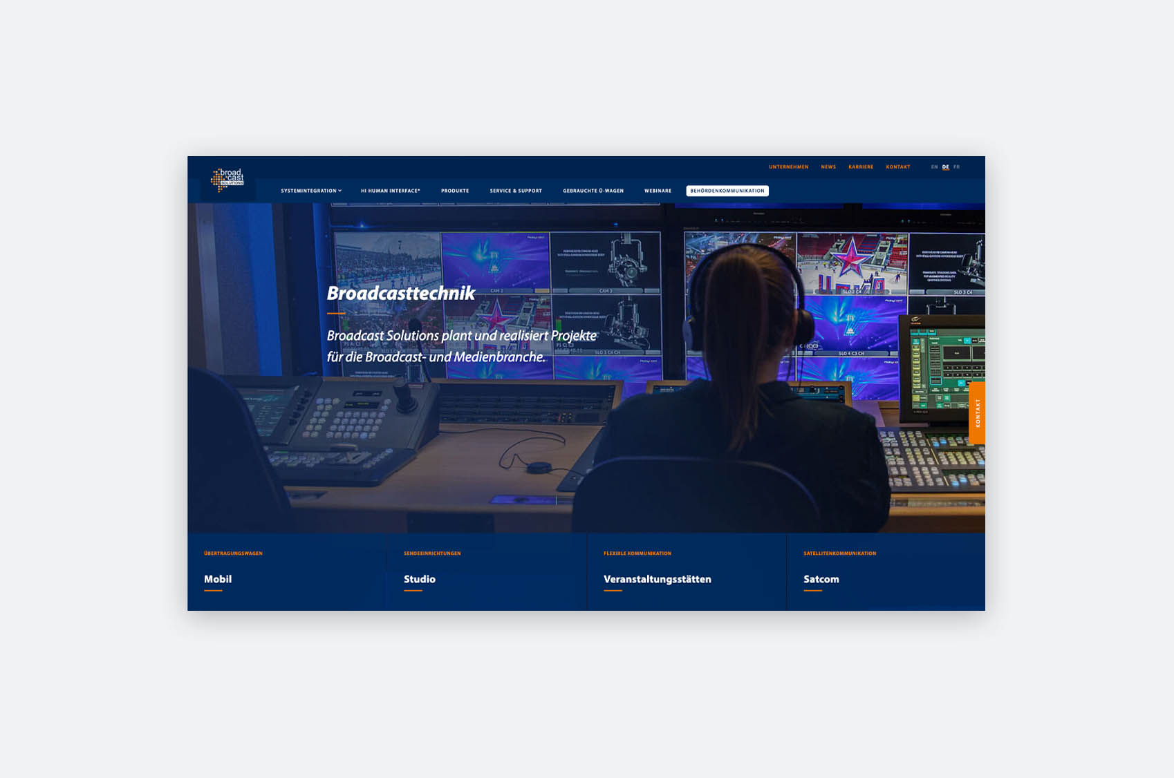 Unsere Lösung bestand aus der Entwicklung einer Webseite, welche flexibel und eigenständig umgebaut werden kann. Hierzu haben wir unterschiedliche Module entwickelt, welche sich relativ unabhängig voneinander kombinieren lassen. Dabei haben wir besonderen Wert darauf gelegt, dass die Module immer eine CI-treue "Broadcast Solutions" Webseite ergeben, egal in welcher Kombination. Hierzu haben wir das bestehende Corporate Design in seine Funktionsprinzipien zerlegt und daraus Gestaltungsregeln abgeleitet, welche wir auf die jeweiligen Inhaltselemente anwenden konnten.