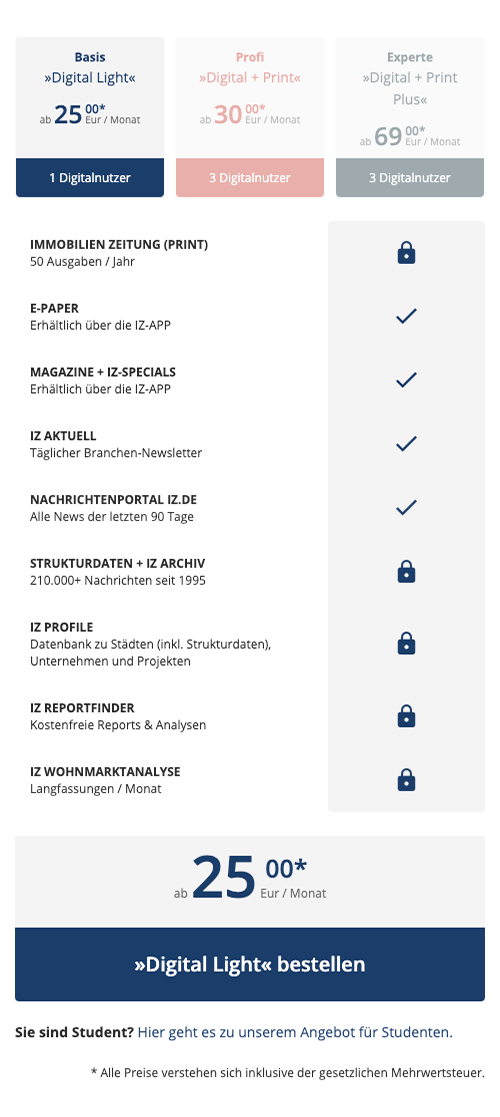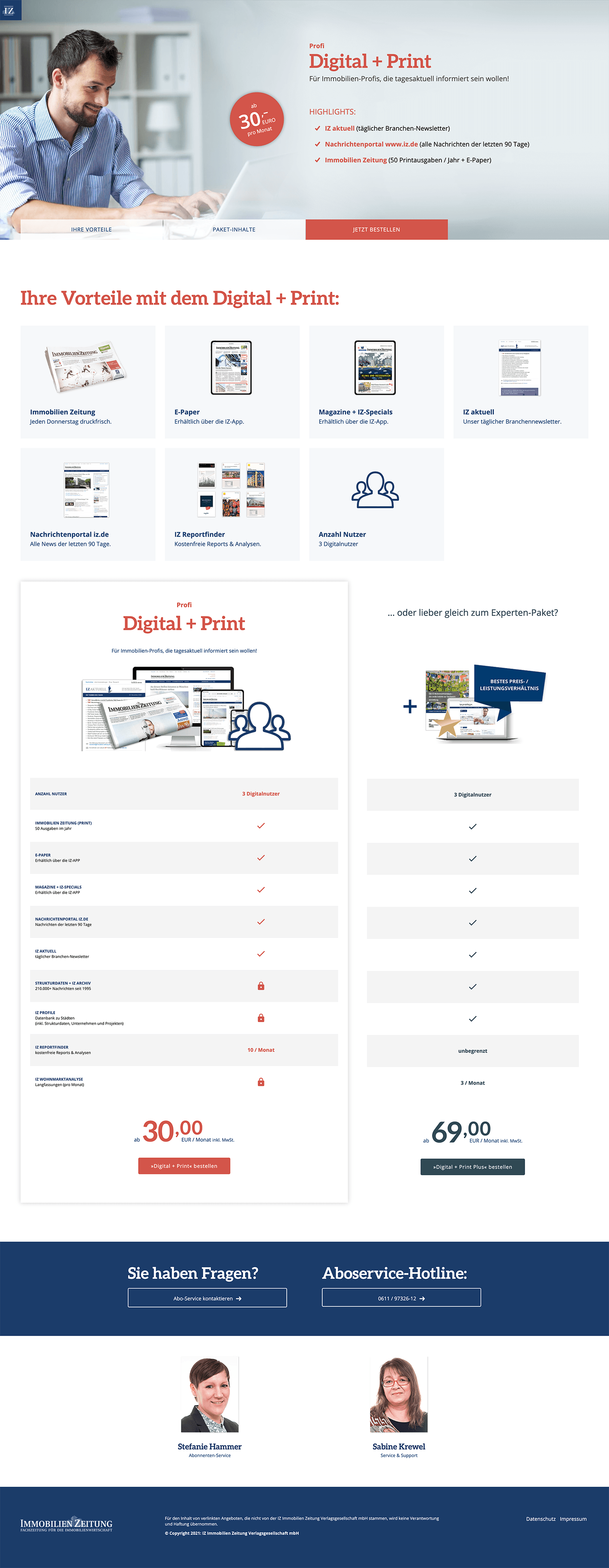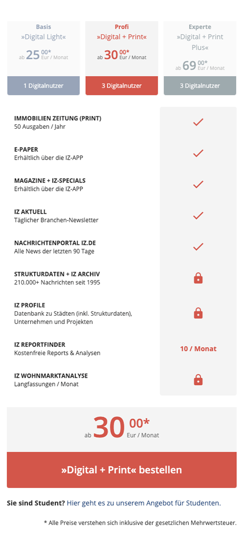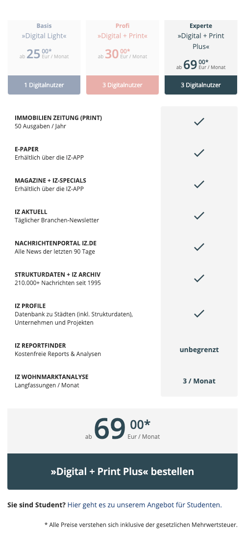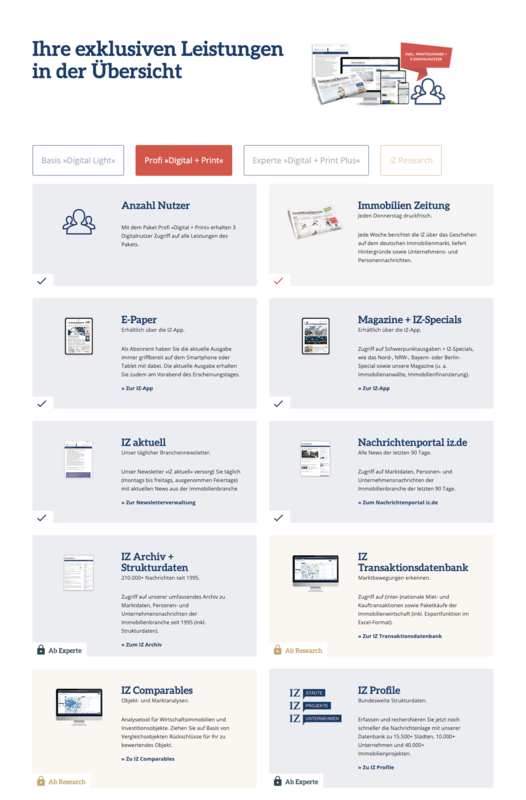 Unser langjähriger Kunde, die „ImmobilienZeitung“ hat drei neue Abonnements erstellt und ist an uns herangetreten diese auf der Website zu präsentieren. Anforderung an dieses Projekt war eine iterative Weiterentwicklung des Layouts der bestehenden Seite, mit Fokus auf Responsivität.