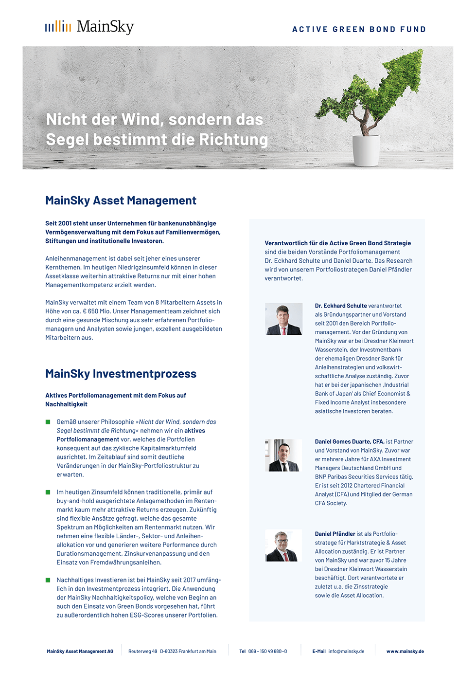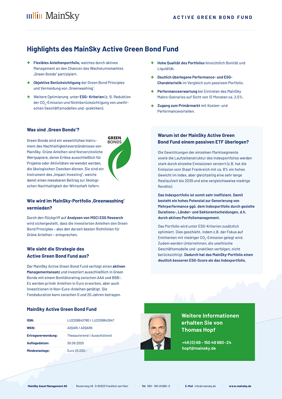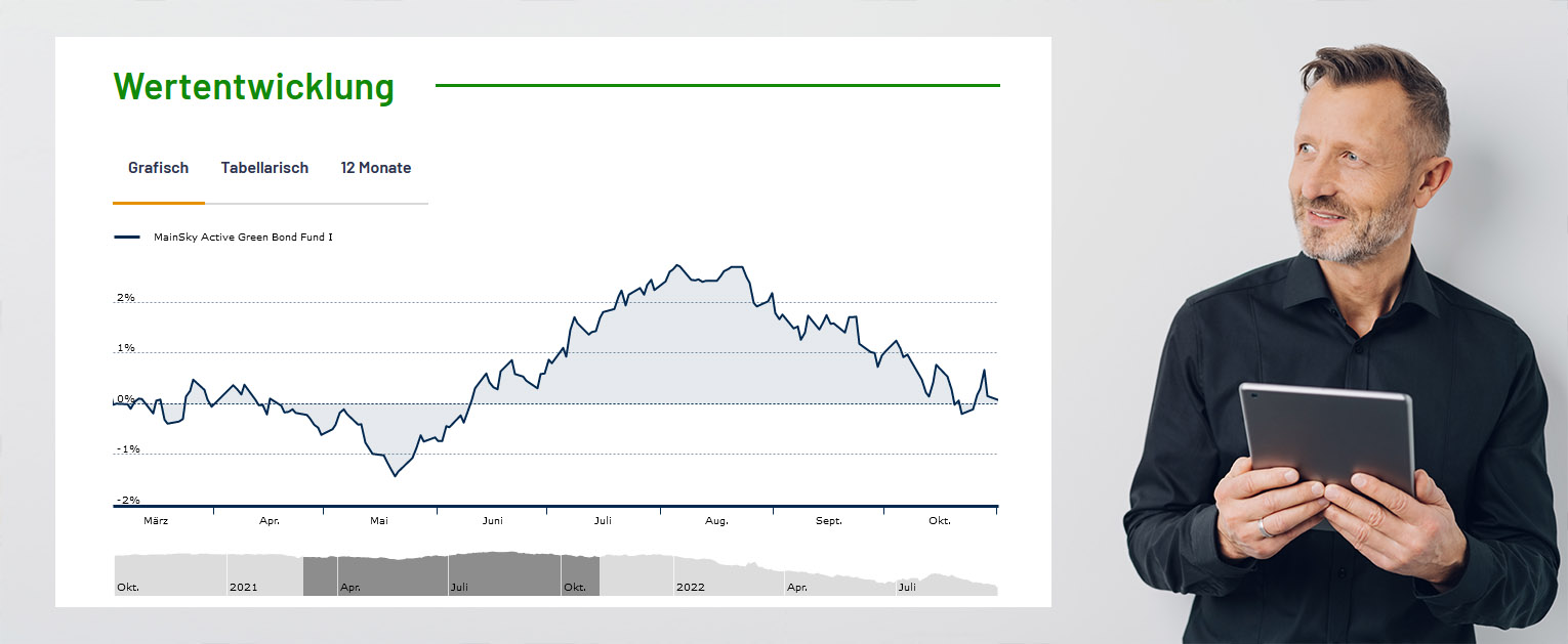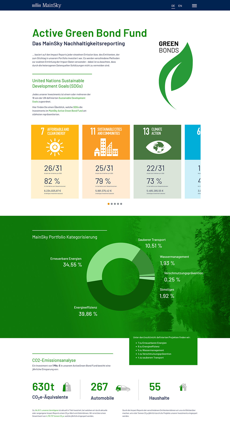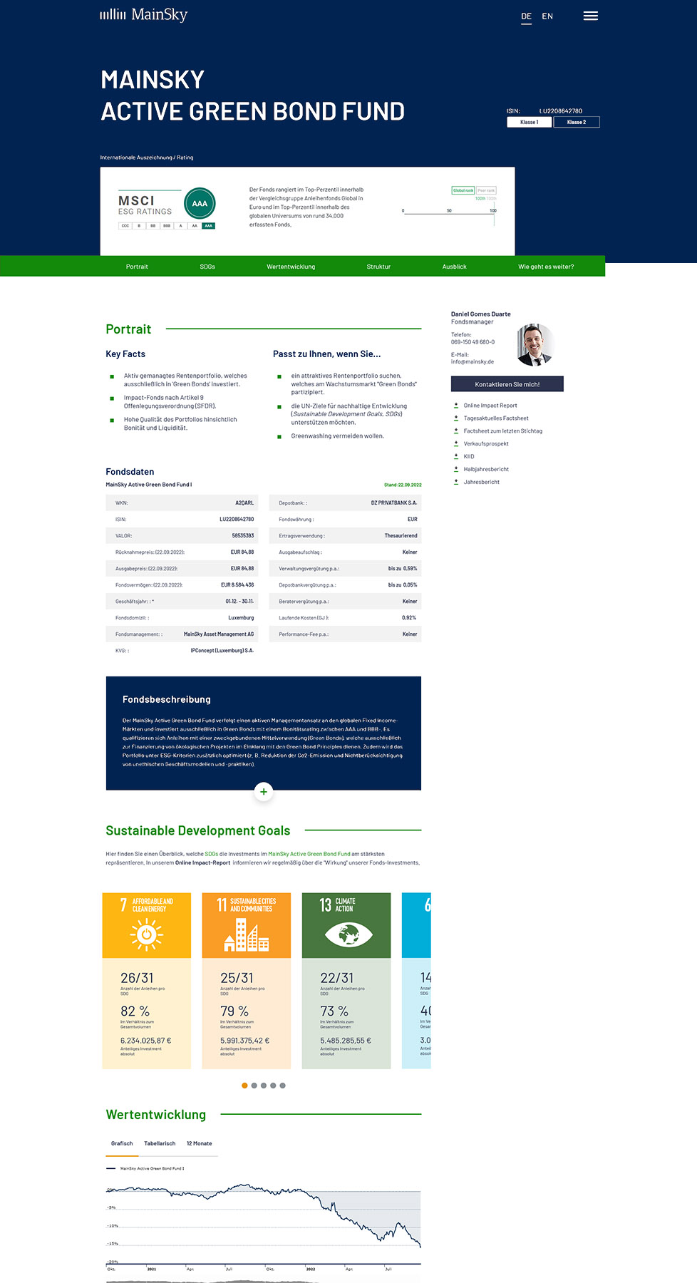 Die Grundzielsetzung war, das bisher analoge Reporting der Investment-Fonds auf ein digitales Format zu übertragen. Wir sind mit MainSky allerdings noch einige Schritte weiter gegangen und haben aus der routinemäßigen Pflichtübung einen echtes Herausstellungsmerkmal für die Investment-Boutique aus Frankfurt entwickelt. Während klassische Online-Steckbriefe auf starren Templates basieren, welche wenig Raum für Individualität bieten, haben wir durch eine dynamische Anbindung an die Datenbasis der Fonds ein Online-Reporting entwickelt, welches Individualität und selbständige Aktualisierung vereint.