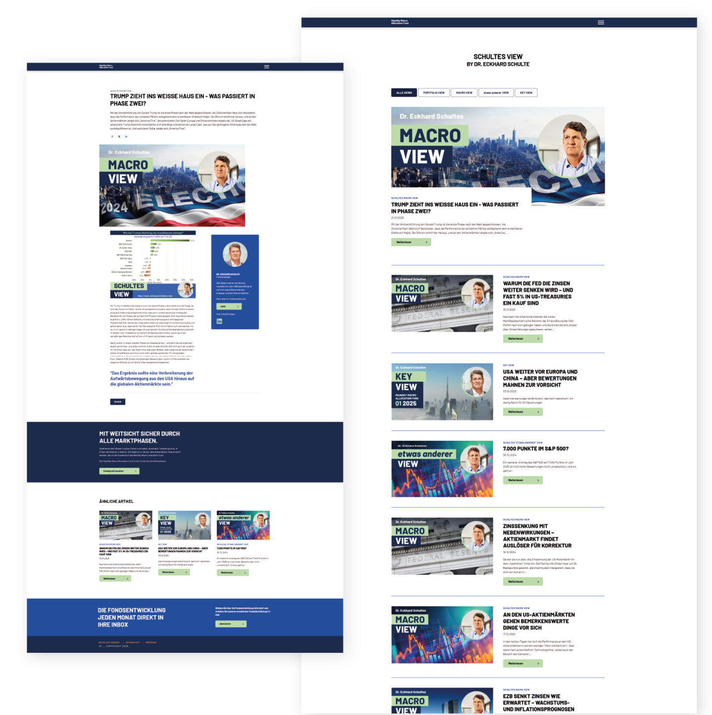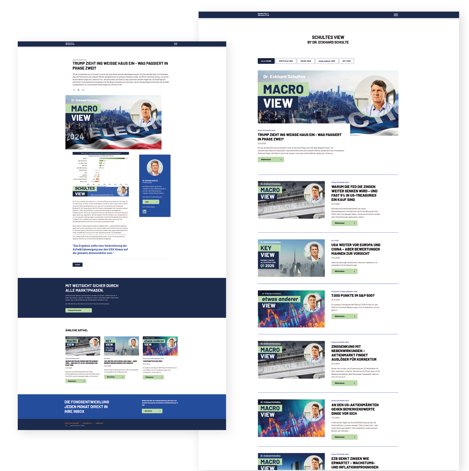 Unter dem Titel „Schultes View“ veröffentlicht Dr. Schulte persönlich verfasste Artikel über wirtschaftliche Themen und bietet seinen Lesern spannende Einblicke in die Finanzwelt. Um ihm eine konsistente und ansprechende Plattform zu bieten, haben wir eine maßgeschneiderte Blog-Vorlage entwickelt, die vom Seitenlayout bis hin zur Gestaltung der Vorschaubilder jedem Beitrag ein harmonisches Erscheinungsbild verleiht. Dieses Template orientiert sich an den Richtlinien des Design-Manuals und gewährleistet, dass alle Inhalte im Einklang mit dem visuellen Konzept der Marke stehen. So wird Schultes View nicht nur informativ, sondern auch optisch einheitlich und wiedererkennbar.