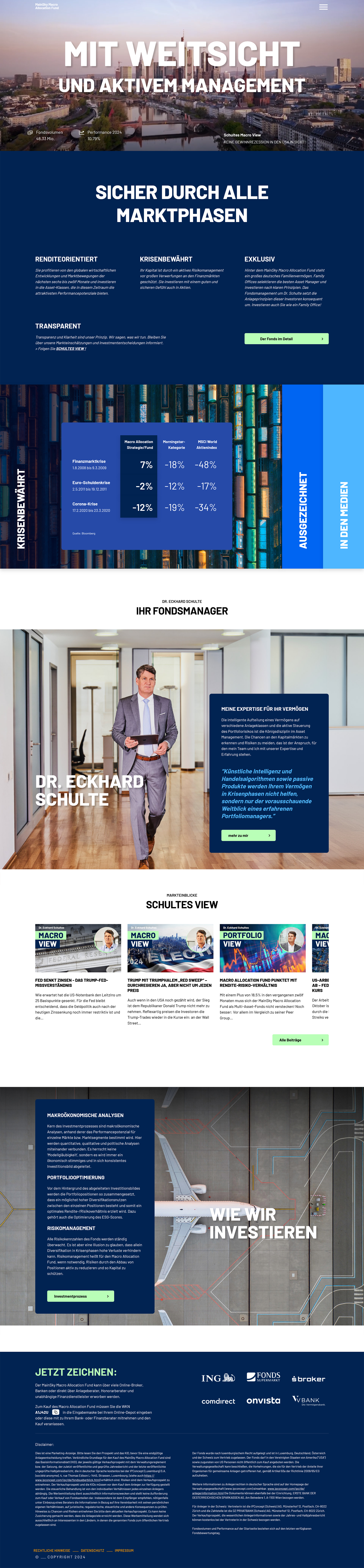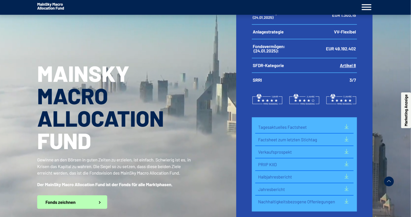 Zusammen mit MainSky haben wir für deren Macro Allocation Fund eine alternative Landingpage entwickelt und ein umfassendes Corporate-Design-Manual sowie ein eigenes Logo erstellt. Das Design differenziert den Fonds von MainSky, bleibt jedoch dem charakteristischen MainSky-Stil treu. Mit einer neuen Farbpalette, einem markanten Logo und visuellen Elementen präsentieren wir den Fonds und Dr. Schulte in einem frischen und modernen Licht, das die Kernwerte der Marke unterstreicht und zugleich die Einzigartigkeit des Fonds betont.