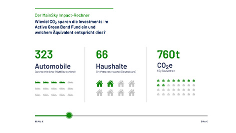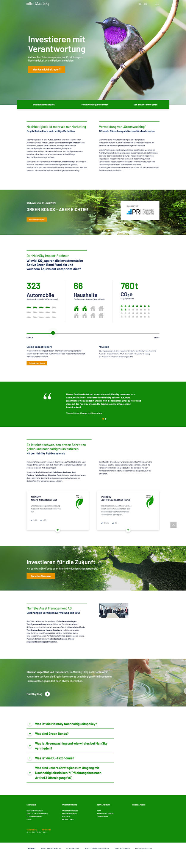Die Story der Webseite wird in drei Schritten erzählt: 1. Was ist Nachhaltigkeit, 2. Verantwortung übernehmen, und 3. Den ersten Schritt gehen. Der Begriff Nachhaltigkeit wird erklärt und ausführlich erläutert, der Lösungsansatz von MainSky wird deutlich gemacht. Um diesen Worten auch Taten folgen zu lassen, werden die Nutzer:innen im zweiten Schritt animiert, direkt Verantwortung zu übernehmen indem der Impact - wie viel CO2e sie mit einem Investment einsparen könnten - spielerisch erfahren werden kann. Wer schon überzeugt ist, kann direkt den ersten Schritt gehen und sich die möglichen Investitionsmöglichkeiten genauer anschauen. Wer genauer wissen möchte, was wo eingespart wird, öffnet den Online Impact Report.