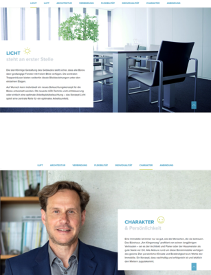 Im Anschluss an Wortfindung und Markenentwicklung, sollte das Konzept der kompromisslosen Büro-Immobilie in eine Landingpage überführt werden. Diese sollte als zentrales Kommunikationsinstrument für alle weiteren Marketing-Aktivitäten dienen und die Story der acht Erfolgskriterien bildlich und inhaltlich vorstellen: Eine kompakter Pitch der einzigartigen Vorzüge anhand einer geführten, virtuellen Tour durch das Gebäude.