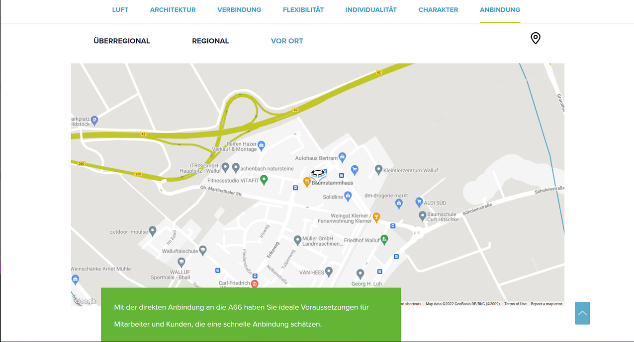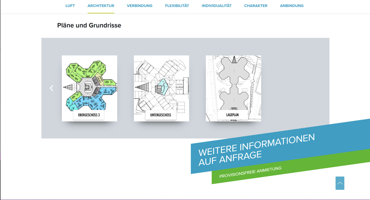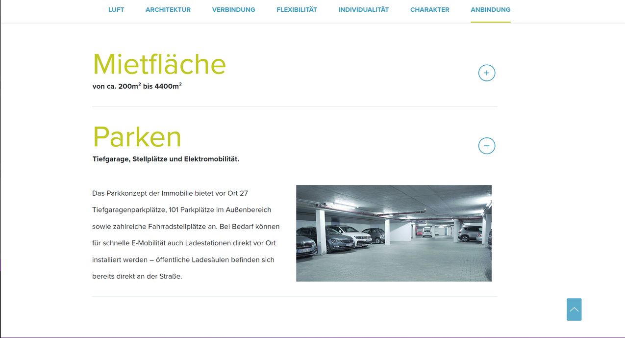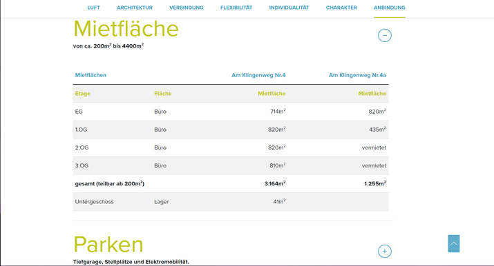 Über eine Scroll-Navigation kann die informationsreiche Seite spielend leicht und rasch navigiert werden. Auf einen Blick sind Gebäudegrundrisse, Mietflächen, Park- und Anfahrtswege leicht zu erkennen. Weiterführende Informationen können über aufklappbare Bereiche erschlossen werden.