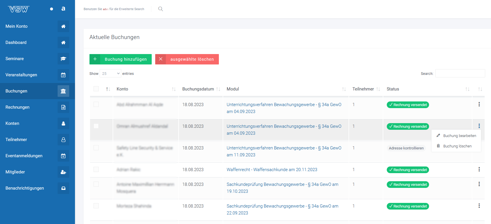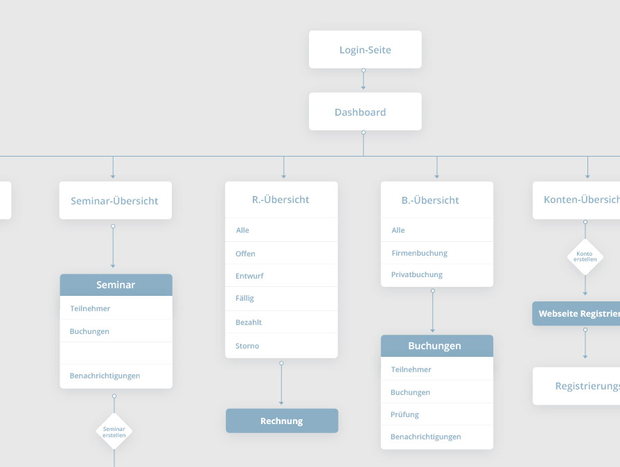 Neben den Standardanforderungen, wie der Pflege des Seminarkatalogs, Handhabung der Buchungen oder Ressourcenmanagement sollte auch der gesamte Bereich der Rechnungsstellung über das Backend abgewickelt werden können.