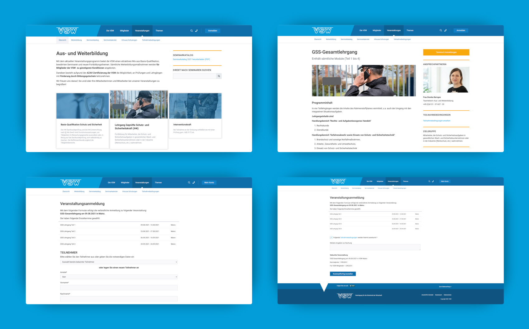 Die Aufgaben der VSW sind umfangreich und vielfältig, die Zielgruppen reicht vom internationalen Konzern über Behörden und Politik bis hin zum Ein-Mann-Sicherheitsdienst. Die Webseite des gemeinnützigen Unternehmens muss alle diese Interessensgruppen ansprechen und gleichzeitig ihre wichtigste Dienstleistung prominent und attraktiv in den Vordergrund stellen: das umfangreiche und differenzierte Seminarangebot.