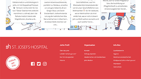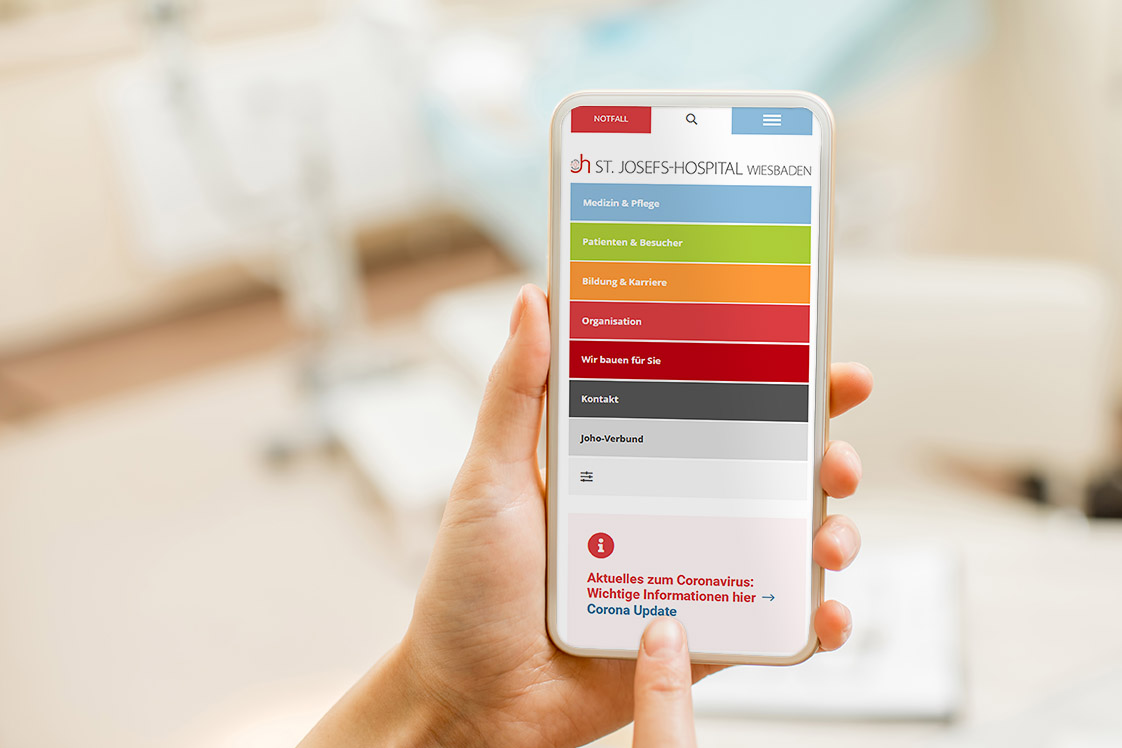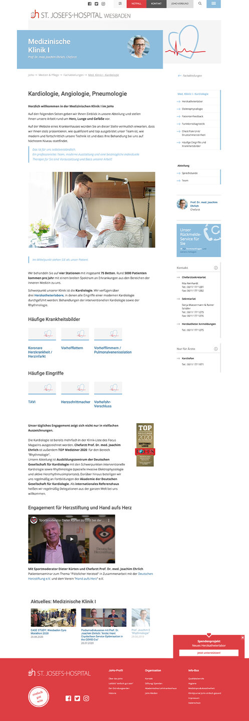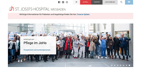 Als zentral gelegenes Krankenhaus, ist das JoHo für viele Wiesbadener quasi DAS städtische Krankenhaus. Diese Nähe wollten wir auch über den Internetauftritt spührbar machen. Statt einer distanzierten Hochglanzoptik sollte eine lebendige, menschliche und authentische Seite entstehen. So haben wir selbst im Navigationskonzept diese dem Menschen zugewandte Philosophie einfließen lassen.